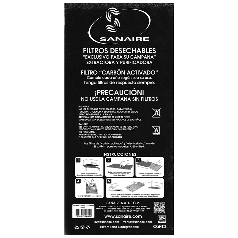 Filtro para Campana Carbón Activado (negro) A-60 (1 Pieza) Sanaire
