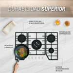 | Quemadores | 1 Quemador central triple 3.5kw 2 Quemadores superiores rápidos 3.0kw 1 Quemador izquierdo inferior semi-rápido 1.75kw 1 Quemador derecho inferior auxiliar 1.0kw |