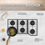 | Quemadores | 1 Quemador inferior izquierdo triple 3.5kw 1 Quemador central superior rápido 3.0kw 2 Quemadores superiores semi-rápidos 1.75kw 1 Quemador inferior central semi-rápido 1.75kw 1 Quemador inferior derecho auxiliar 1.0kw |